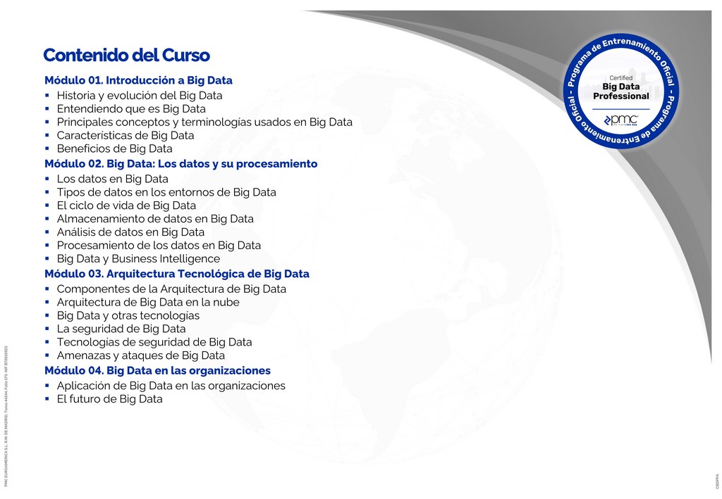 Nuestro programa de entrenamiento y certificación oficial, se centra en proporcionar al candidato con todos los conocimientos que le permitan conseguir la certificación “Certified Big Data Professional” de la Global Trust Association. Esta certificación está enfocada en acreditar el conocimiento de los profesionales sobre los aspectos que giran en torno a los fundamentos de Big Data; tales como tecnologías, arquitectura, aplicación y herramientas para el procesamiento de la información que contribuyen a la toma de decisiones, la automatización de procesos, la gestión comercial, entre otras actividades claves dentro de la organización.