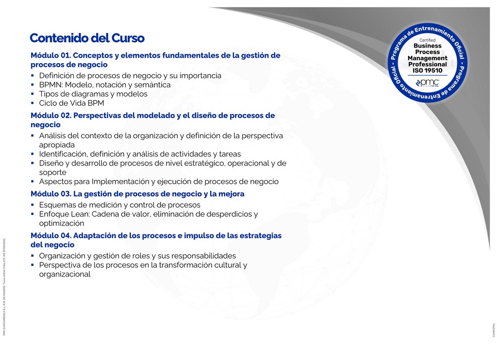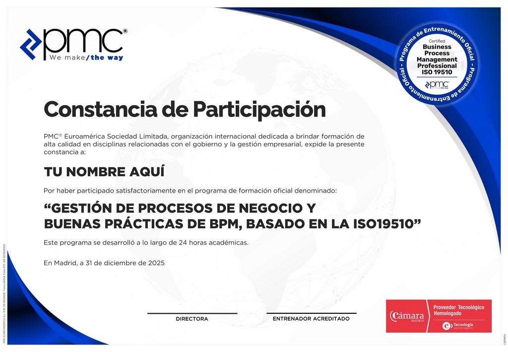 Nuestro programa de entrenamiento y certificación oficial se centra en proporcionar a todos los participantes, los conocimientos necesarios para dominar la gestión de procesos de negocio, a través de las diferentes técnicas y enfoques contempladas sobre la base técnica de notación y modelado del estándar ISO/IEC 19510, de modo tal que este enfoque de gestión de procesos sirva para facilitar iniciativas de cambio, mejora y transformación de procesos a todo nivel: estratégico, operacional y de apoyo.