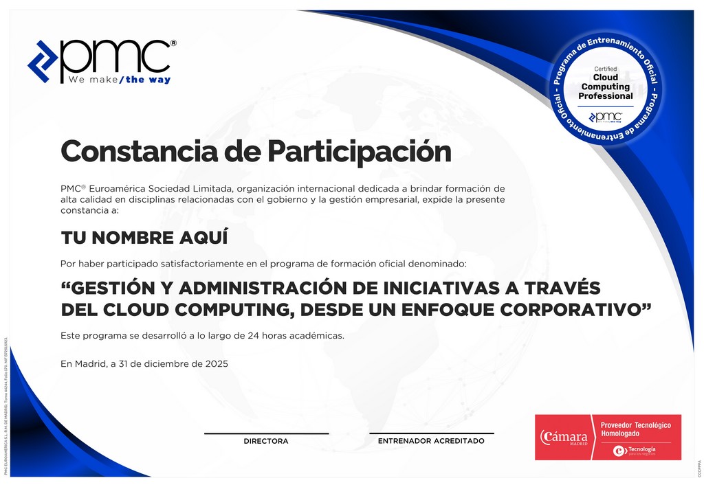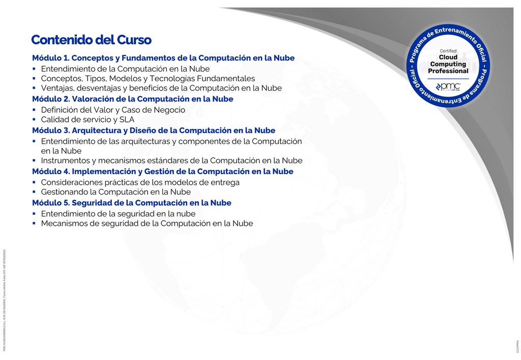 Nuestro programa de entrenamiento y certificación oficial, se centra en proporcionar a todos los participantes del conocimiento necesario, siempre desde un punto de vista agnóstico, respecto a la administración de servicios a través de “la nube”. Se busca generar un entendimiento que permita a los participantes, ser conscientes de las verdaderas implicancias de llevar adelante un proyecto o servicio con la nube de por medio, temas como la seguridad, los riesgos, los niveles de entrega en los servicios, el equilibrio entre costo y calidad, son algunos de los aspectos abordados en este programa, más allá de uno u otro fabricante.