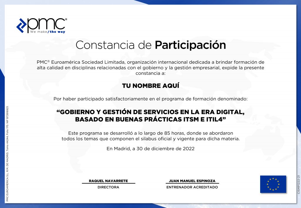 - Voucher para el examen de Certificación Oficial PeopleCert – ITIL®4, bajo las condiciones establecidas por la casa certificadora, cuya emisión se coordinará previamente con PMC, luego de cancelada en su totalidad la factura y con 15 días de antelación. Este examen tiene solo un intento, y el voucher tiene una duración de 12 meses.