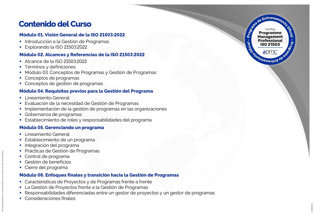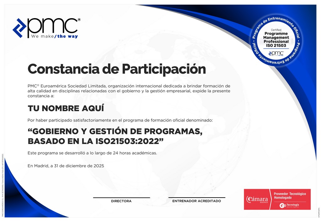El programa de entrenamiento para la certificación “Certified Programme Management Professional, based on ISO21503:2022” de la Global Trust Association, tiene como objetivo acreditar que el candidato cuenta con suficientes conocimientos, competencias y comprensión acerca de los conceptos y prácticas que resultan relevantes para asegurar el éxito en la gestión de programas, y garantizar los beneficios esperados por la organización.