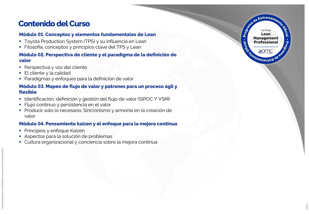 Esta certificación busca acreditar el conocimiento para reducir, retirar y prevenir la existencia de “desperdicios” en los procesos de la organización. Todo esto sobre la base de los fundamentos de Lean, como el TPS, Kaizen, Just In Time, Jidoka y otros más, para poder adoptar correctamente la filosofía Lean y con ello lograr mejoras tangibles para una organización.