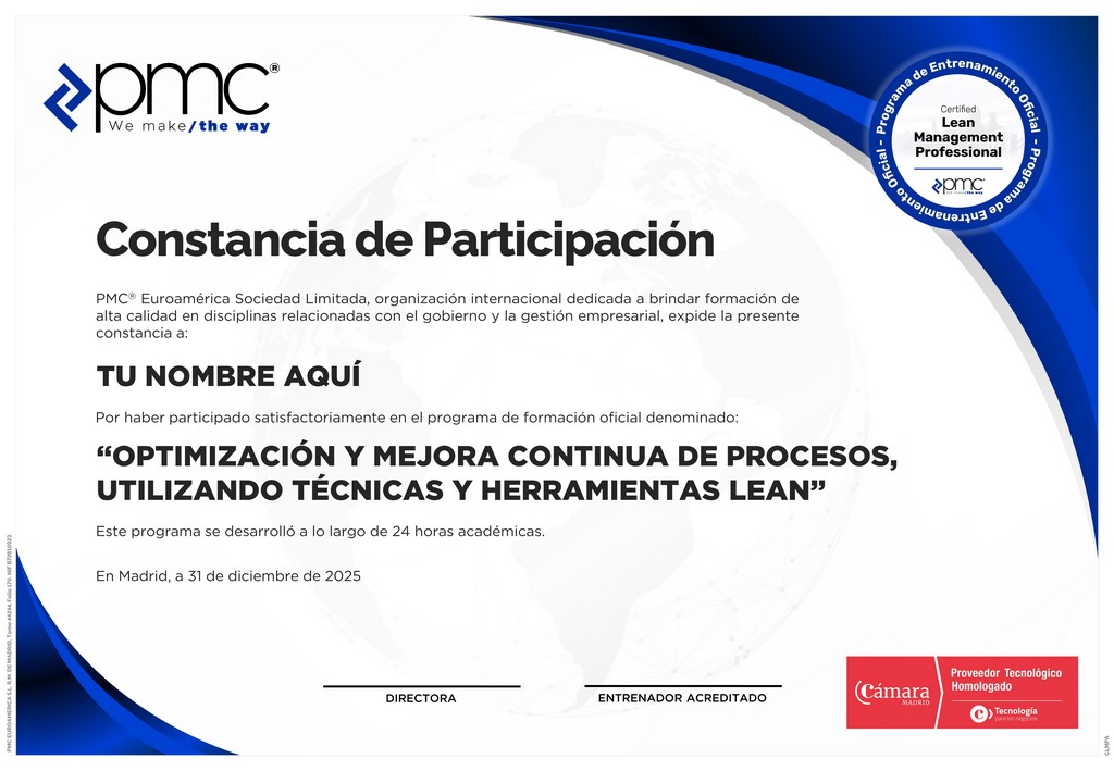 Nuestro programa de entrenamiento Lean Management, conducente a la certificación “Certified Lean Management Professional” de la Global Trust Association, se centra en proporcionar a todos los participantes un enfoque amplio respecto a la optimización de procesos, a través de la identificación, clasificación y eliminación de desperdicios, así como la identificación y elaboración de los mapas de cadena de valor (VSM).